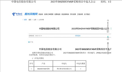 ? ? ? ? ? ? ? ? ? ? ? ? ? 據(jù)中國電信“陽光采購網(wǎng)”2023年12月11日消息,我司顯示產(chǎn)品中標(biāo)(金額351萬)中國電信。(營銷部供稿)